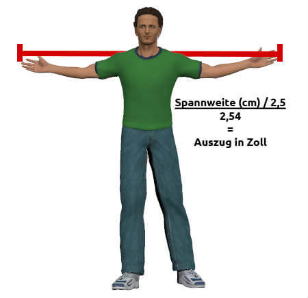 Die Pfeillänge richtet sich nach deiner Auszugslänge. Messe deinen Auszug zum Beispiel nach folgender Methode: