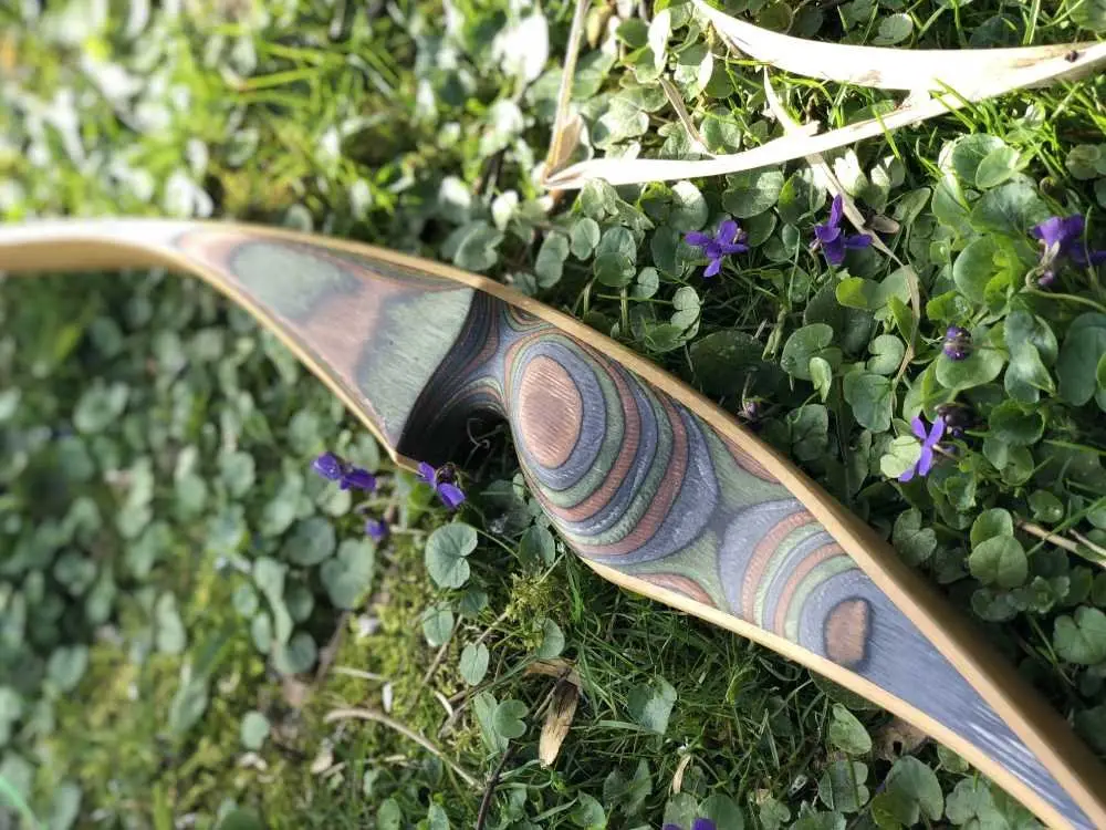 Die Wurfarme bestehen aus mehreren Lagen: Ein Kern aus Bambus oder Ahorn bildet die Basis, darüber liegen Fiberglas- oder Carbon-Schichten für Stabilität und Leistung. Deckschichten aus Hartholz geben dem Bogen seine charakteristische Optik. Diese Sandwich-Bauweise verbindet traditionelle Ästhetik mit modernen Materialien.